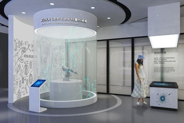 “企業數字化”、“騰飛未來”等板塊,展廳主要通過搭建多個場景還原訊飛產品在現代生產生活中的應用,同時通過互動觸摸屏、物體識別桌、機械臂、VR等創意性展項,將訊飛企業理念、產品核心賣點與展項及場景相融合,智能化的展項與科技風的空間風格既凸顯了科大訊飛企業智能化的特點,同時也助力展示企業的核心優(yōu)勢與價值理念。